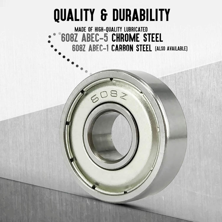 - SMOOTH, PRECISE ROTATION - Engineered to fit roller skates, roller blades, inline skates, scooters, and skateboards, these 608ZZ bearings ensure a steady, efficient ride without compromise. Available in ABEC-5 chrome steel and ABEC-1 carbon steel options.